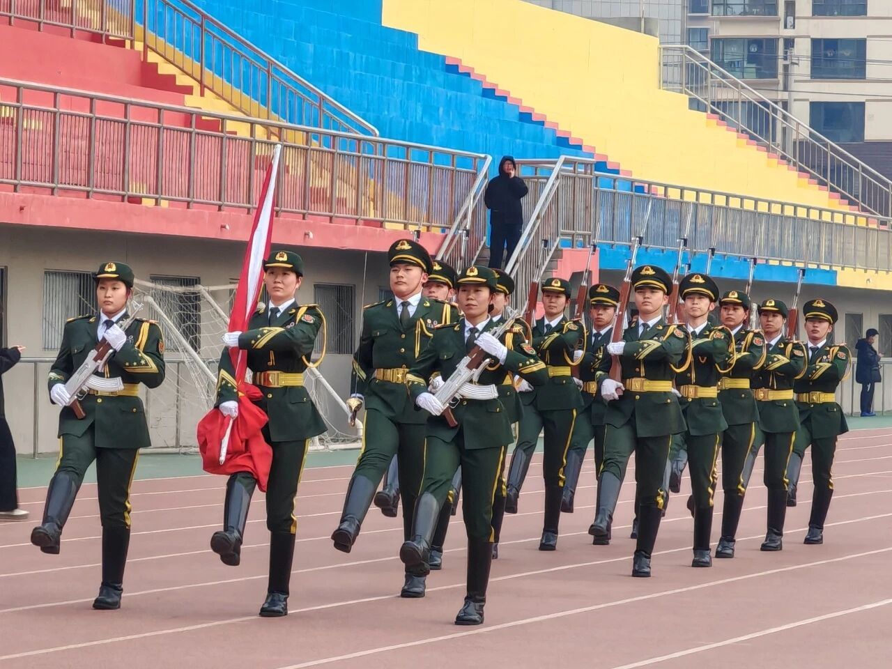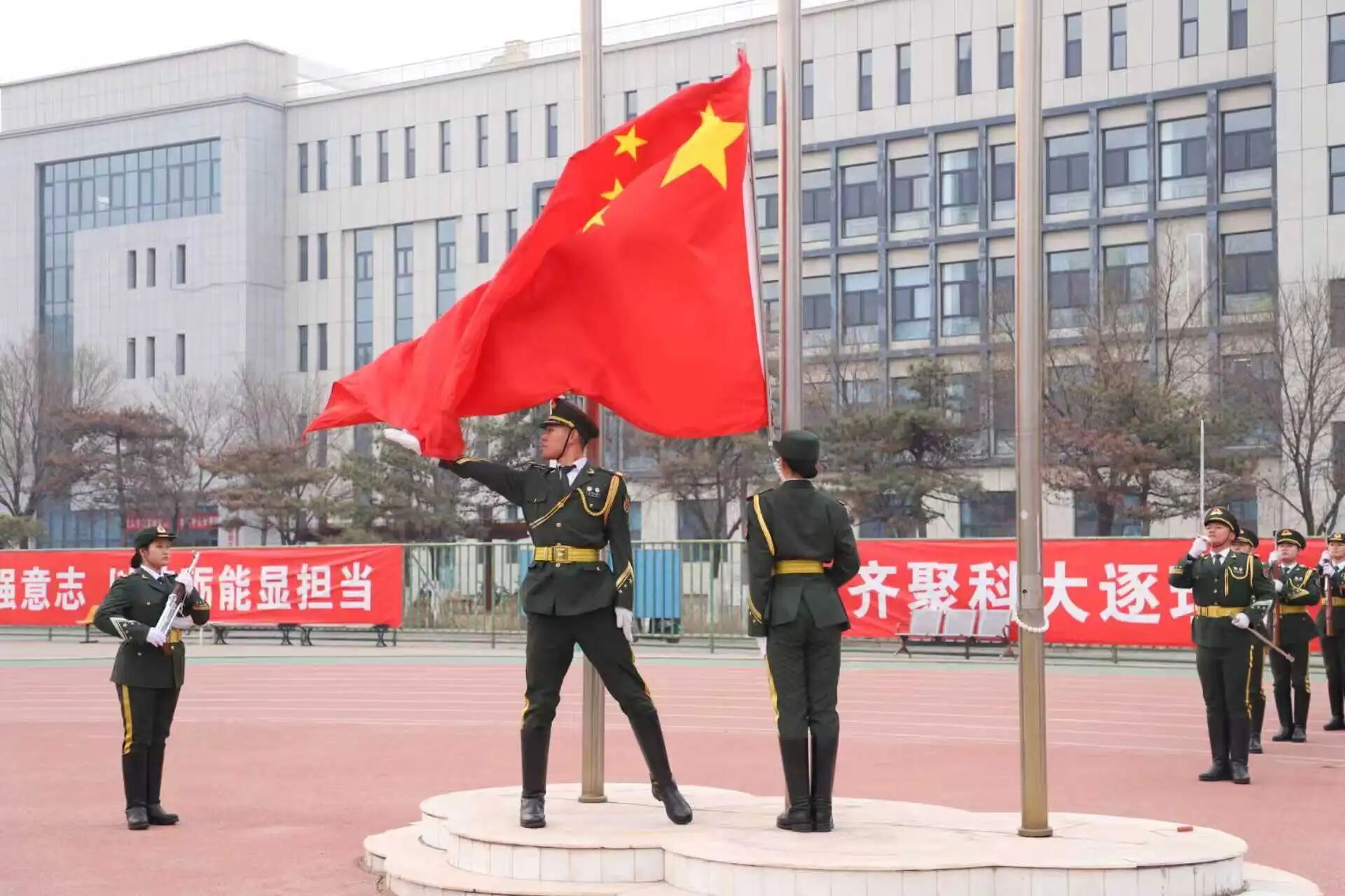 伴随着雄壮激昂的《义勇军进行曲》,五星红旗冉冉升起,全体师生肃立注目。