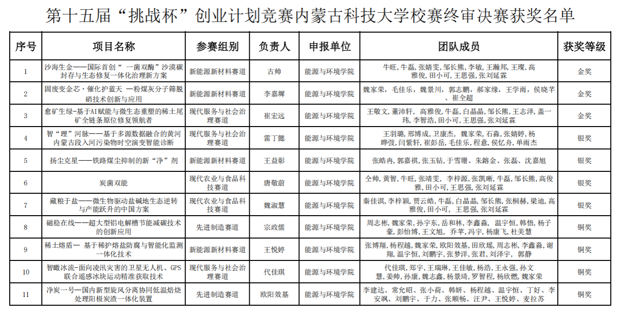 近日,内蒙古科技大学第十五届“挑战杯”大学生创业计划竞赛决赛圆满落幕。在这场被誉为当代大学生科技创新“奥林匹克”的盛会中,我院青年学子敢闯敢创、奋勇争先,凭借扎实的专业素养和出色的项目表现,最终斩获金奖3项、银奖4项、铜奖4项!