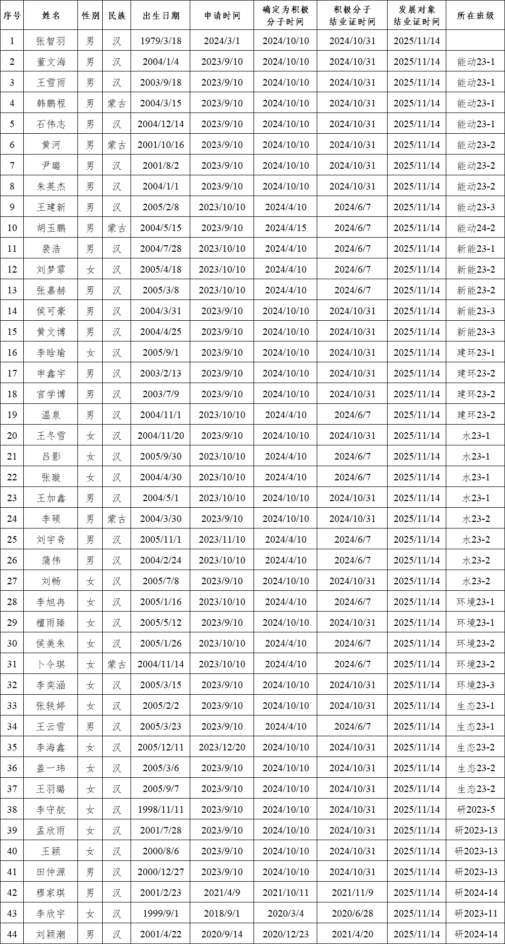 经过一年以上的培养教育和考察,张智羽、董文海、王雪雨、韩鹏程、石伟志、黄河、尹璐、朱英杰、王建新、胡玉鹏、裴浩、刘梦霏、张嘉赫、侯可豪、黄文博、李晗瑜、申鑫宇、宫学博、温泉、王冬雪、吕影、张璇、王加鑫、李硕、刘宇奇、蒲伟、刘畅、李旭冉、檀雨臻、侯美朱、卜令琪、李奕涵、张轶婷、王云雪、李海鑫、盖一玮、王羽璐、李守航、孟欣雨、王颖、田仲源、穆家琪、李欣宇和刘颖潮共四十四位同志拟接收为中共预备党员(详见附表)。为进一步增强发展党员工作的透明度,确保发展新党员的质量,根据《中国共产党章程》和《中国共产党发展党员工作细则》,现将发展对象的基本情况予以公示。
